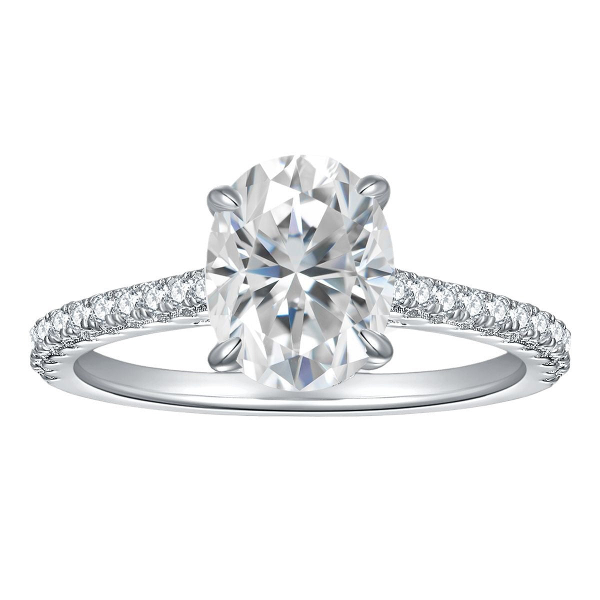 Nuestro increíble solitario presenta una deslumbrante Moissanita corte oval de 3 quilates, realzada por un delicado halo escondido que añade profundidad y brillo sutil desde cada ángulo.