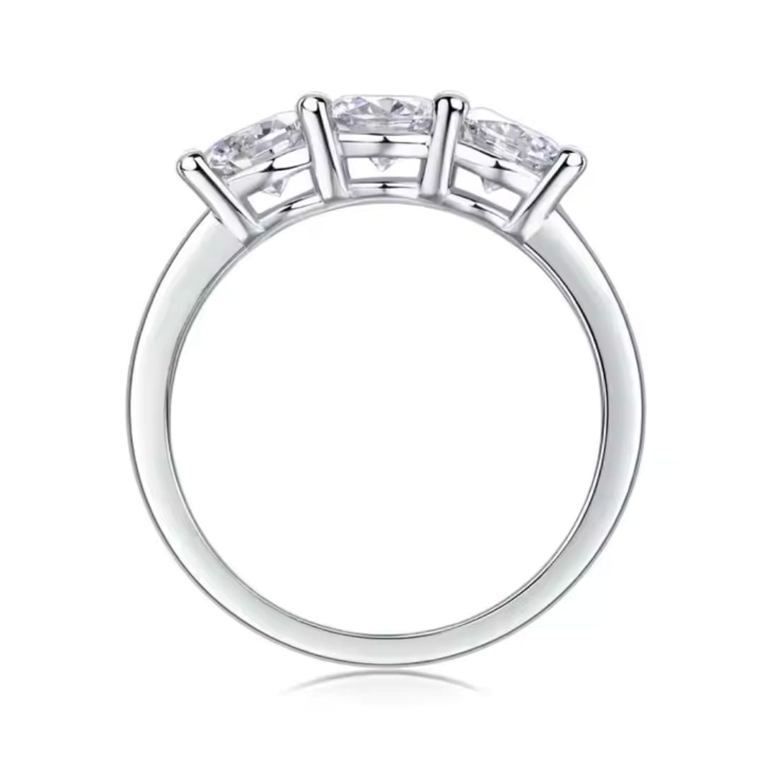 Cuenta con un diseño clásicas de tres piedras de medio quilate cada una. Las 3 moissanitas representan en pasado, presente y futuro, creando un equilibrio perfecto entre una simbolismo y belleza. Este anillo es una pieza que trasciende el tiempo.