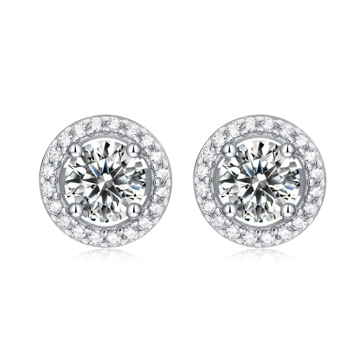 Cada pieza está engastada con una moissanita central de 0.50 quilates, rodeada por un delicado halo de pequeñas piedras que potencian su luminosidad en cada movimiento.